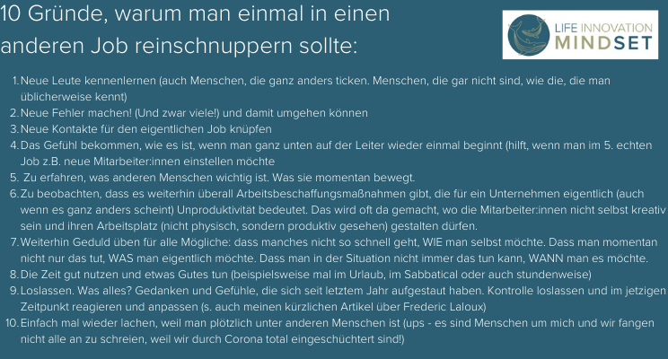 zu 1: auch Menschen, die ganz anders ticken. Menschen, die. gar nicht sind, wie die, die man üblicherweise kennt. zu 2: Und zwar viele! ... und damit umgehen können zu 4: Hilft, wenn man im 5. echten Job z.B. neue Mitarbeiter:innen einstellen möchte zu 6: Auch wenn es ganz anders scheint: Es bedeutet Unproduktivität. Das wird oft da gemacht, wo die Mitarbeiter:innen nicht selbst kreativ sein und ihren Arbeitsplatz (nicht physisch, sondern produktiv gesehen) gestalten dürfen. zu 7: Dass manches nicht so schnell geht, WIE man selbst möchte. Dass man momentan nicht nur das tut, WAS man eigentlich möchte. Dass man in der Situation nicht immer das tun kann, WANN man es möchte. zu 8: Beispielsweise mal im Urlaub, im Sabbatical oder auch stundenweise zu 9: Was alles? Gedanken und Gefühle, die sich seit letztem Jahr aufgestaut haben. Kontrolle loslassen und im jetzigen Zeitpunkt reagieren und anpassen (s. auch meinen kürzlichen Artikel über Frederic Laloux in Linkedin) zu 10:Weil man plötzlich unter anderen Menschen ist! (ups - es sind Menschen um mich und wir fangen nicht alle an zu schreien, weil wir durch Corona total eingeschüchtert sind!) Warum blogge ich das? Es ist nun das 2. Mal, dass ich in einen „anderen“ Job, neben meiner eigentlichen Tätigkeit als Coach reinschnuppere. Warum tue ich das? In meinen Work-Life-Design Seminaren lasse ich die Teilnehmer:innen erfahren, wie es ist, wenn man Erkenntnisse über sich selbst erlangt, um ihr Leben besser in Einklang mit ihrer Arbeit zu bringen. Dabei ermutige ich sie, einen „realen“ Schritt zu unternehmen. Ein „Reinschnuppern“ reicht vollkommen, ohne dass man gleich den momentanen Job kündigen muss. Um zu verstehen, wie sich meine Teilnehmer:innen dabei fühlen, ist es für mich essentiell, dies auch hin und wieder zu erleben. Meine erste große Erfahrung habe ich 2018 in Kanada gemacht, als ich 1 Monat lang als Volontärin auf einem Whalewatching Schiff ausgeholfen habe. Das war eine so spannende Erfahrung! (Über die ich übrigens auch einmal in meinem allerersten Blog geschrieben hatte). Meine 2. nun ist, dass ich beim Deutschen Roten Kreuz momentan als Schnelltesterin mithelfe. Ich möchte auf der einen Seite einen Beitrag leisten, dass bei uns endlich einmal etwas voran geht. Und das geht eben nur mit impfen und testen. Alles andere ist in meinen Augen verlorene Liebesmüh. Und mir geht es alles weit zu langsam. Auch wenn ich nur ein kleines Zahnrad in diesem System bin, kann ich vielleicht trotzdem einen Beitrag leisten. Außerdem möchte ich die Zeit nutzen, um mal neben meiner mir wirklich am Herzen liegenden Tätigkeit (mein Work-Life-Design Coaching) etwas ganz anderes auszuprobieren. Nicht, weil ich das ab jetzt machen möchte, sondern um wertvolle Erfahrungen zu sammeln. Und diese habe ich für euch oben einmal notiert. Ich hoffe ihr habt auch Gedanken zu dem Thema: 10 Gründe, warum man mal in einen anderen Job reinschnuppern sollte! Es grüßt euch, eure Isa